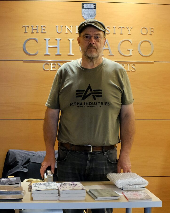 Ralf Friel am Büchertisch von Moloko+ auf der Tagung CUT-UPS@60 (Paris 2023) // Foto: Michael Kellner